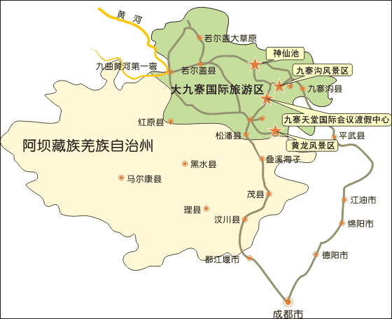 线路一:成都——都江堰市——汶川——茂县——松潘,沿途有都江堰,青城前、后山、叠溪海子等名胜。可采购茂县苹果。至黄龙寺约393公里,九寨沟440公里。此路修缮较好,基本都走这条路。