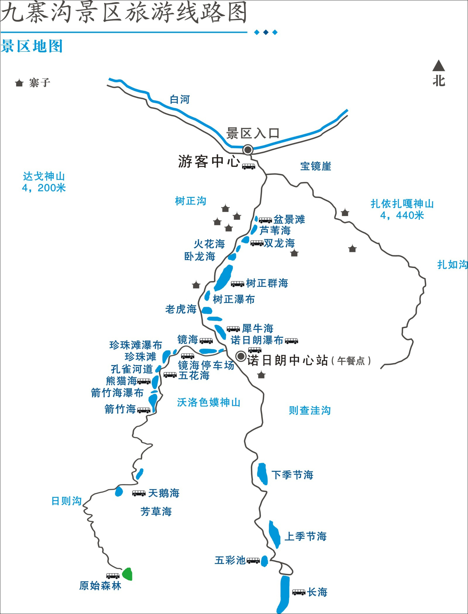沟内禁止社会车辆通行,可乘绿色环保观光车游览,行车区段为:1.沟口—诺日朗14.5公里;2.诺日朗—长海18公里;3.诺日朗—原始森林18公里,共22个招呼站,在景区售票处出售车票,自愿购买,一票全景,分区段检票。